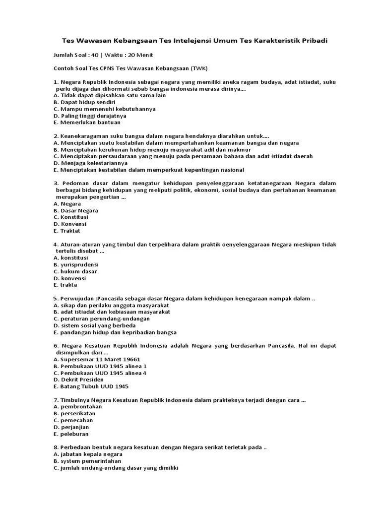 Contoh soal tes wawasan kebangsaan twk lengkap dengan jawabannya.